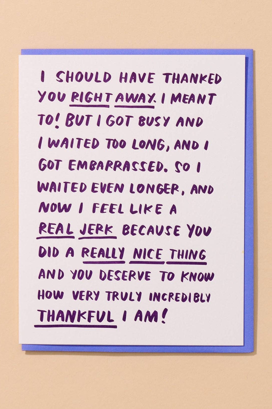 - card reads: " I should have thanked you right away. I meant to! But I got busy and I waited too long, and I got embarrassed. So I waited even longer, and now I feel like a real jerk because you did a really nice thing and you deserve to know how very truly incredibly thankful I am!"