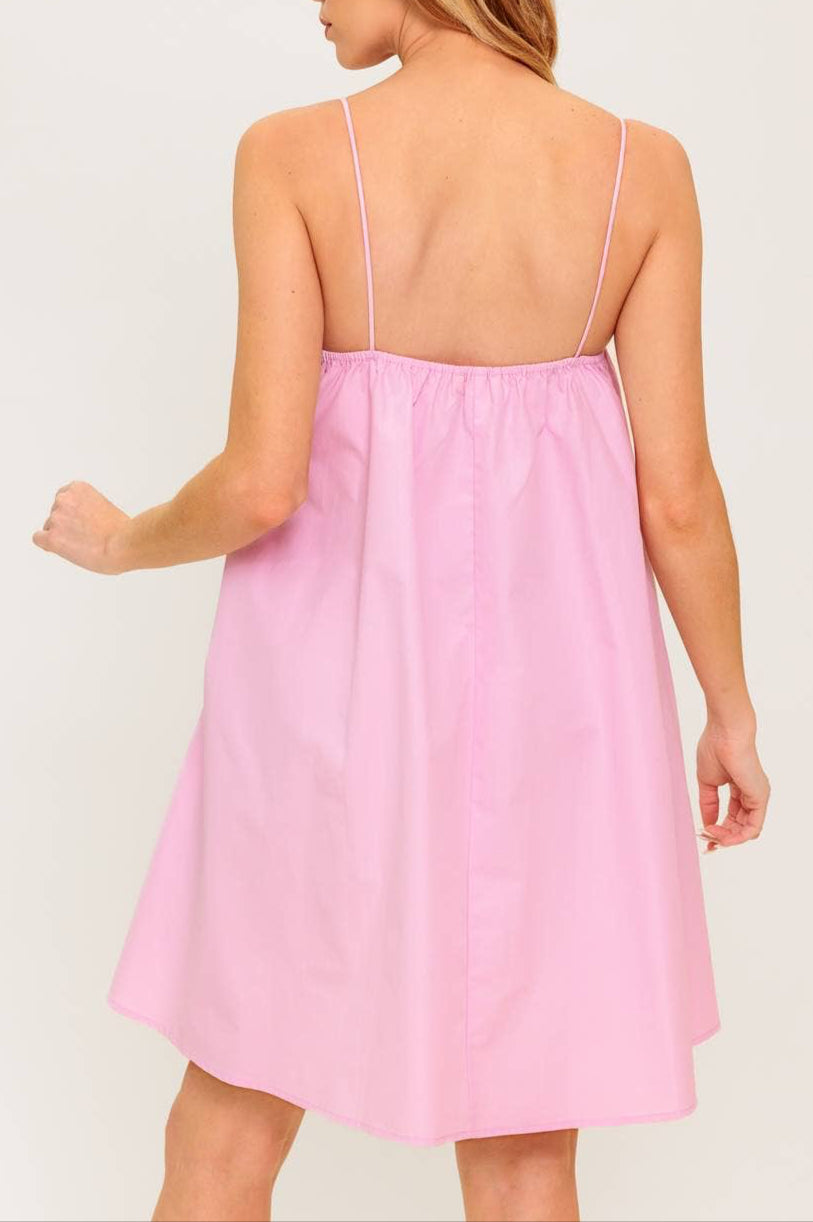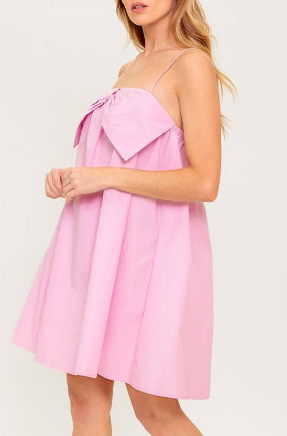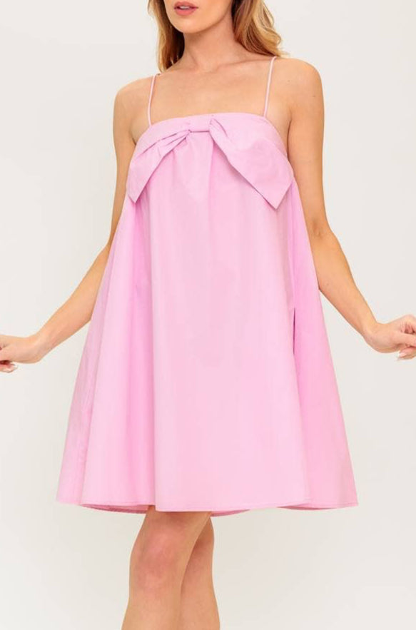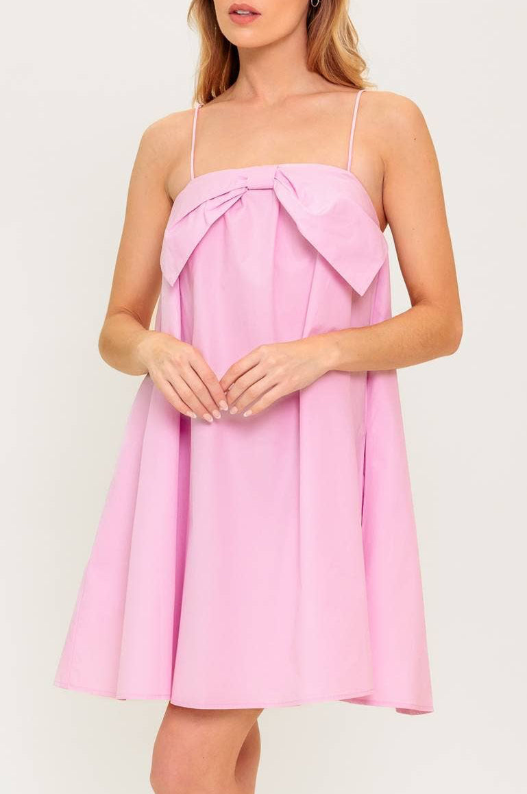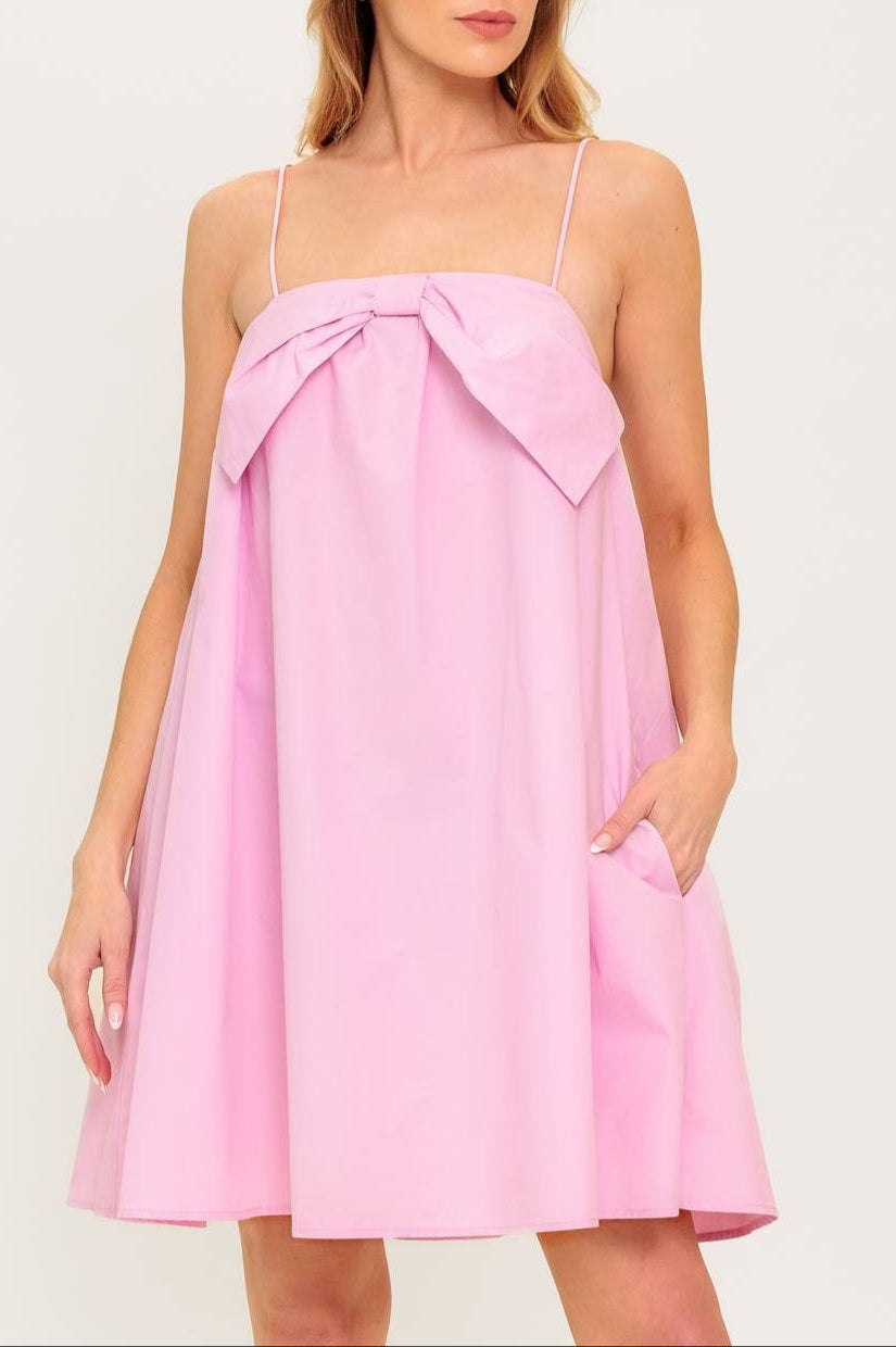 solid woven mini dress featuring straight neckline, front bow detail and elasticized back
