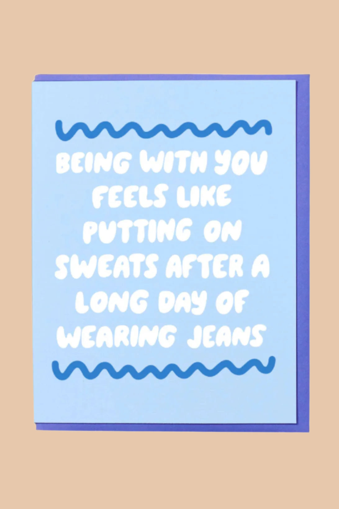 - card reads, “Being with you feels like putting on sweats after a long day of wearing jeans"