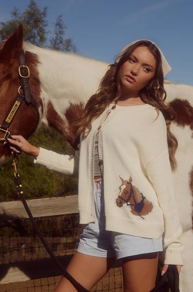 Lightweight and easy to wear, this casual cardigan features an equine theme, classic button-front closure and a relaxed fit that’s perfect for layering year-round. The soft off-white hue keeps it versatile, while the breathable fabric makes it ideal for those in-between weather days. Throw it on over a tank and denim shorts for breezy mornings, or layer it with jeans and sneakers for an easy, laid-back look.